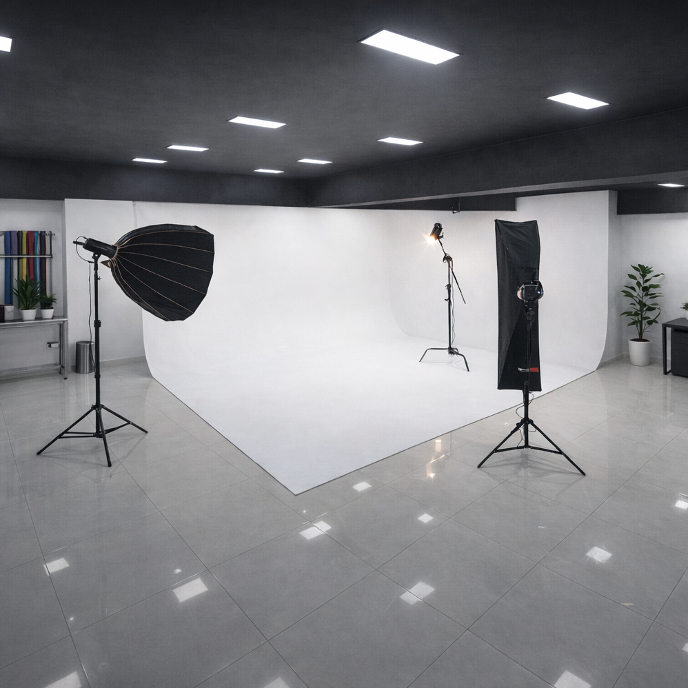 Cuenta con ciclorama blanco, múltiples opciones de iluminación y espacio suficiente para equipos, talento y sets más elaborados.